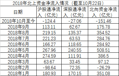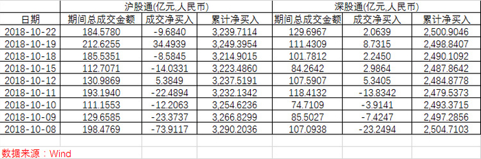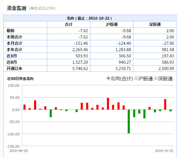 金融监管高层罕见集体谈股市,带动市场情绪迅速回暖,北上资金也大幅流入A股。截至10月19日收盘时,北向资金全天合计流入43.23亿元,其中沪港通净流入34.49亿元,深港通净流入8.73亿元。