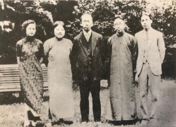 萧友梅(中)、黄自(右2)与国立音专第一届毕业生李献敏、喻宜萱和裘复生合影