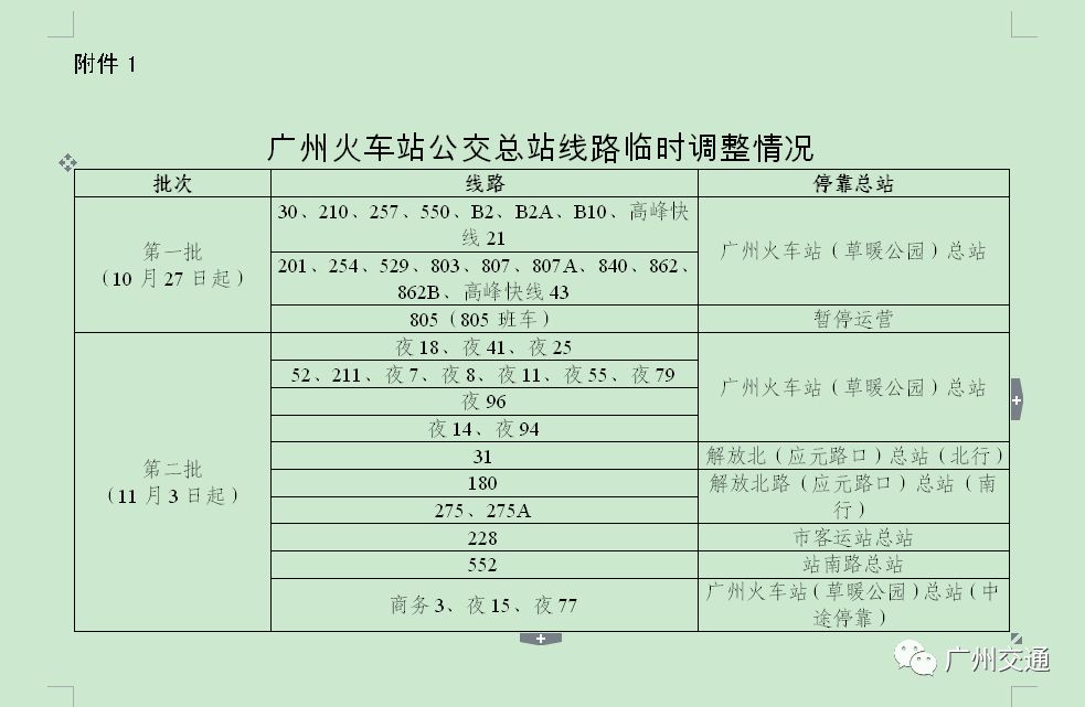 调整广州火车站始发东行或北行通往白云区、天河区等区域的线路至广州火车站(草暖公园)总站运营18条线路。公共汽车805路将同步暂停运营。
