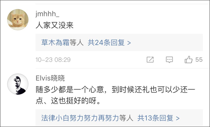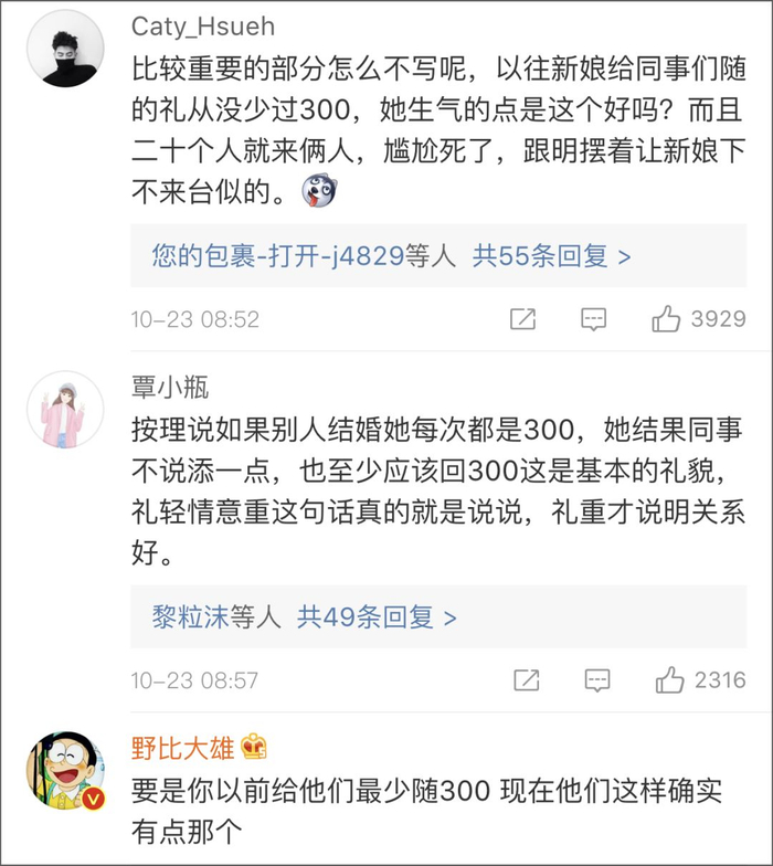 不过这还不算什么,等到婚宴结束,小徐收到到场的那位同事发来的转账,写明金额1314元,同事还告诉小徐,这是部门所有同事集体随礼,祝愿他们“一生一世相爱”。1314元,平均下来一个同事不到一百元的随礼,丈夫笑称这么个随礼法还是第一次见到,不晓得同事们关系是有多差。