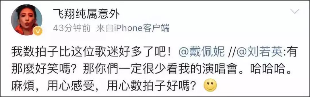 而这位当时“砸场”的歌迷,这次也转发了刘若英的微博,顺便还向戴佩妮“邀功”:你看好歹我拍子数得是对的!