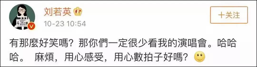 而被粉丝戏称为“千年不更博”的当事人刘若英今天也发了一条微博佯装生气,开玩笑叫粉丝们以后听演唱会要用心打节拍。