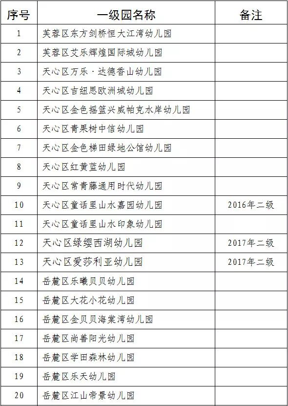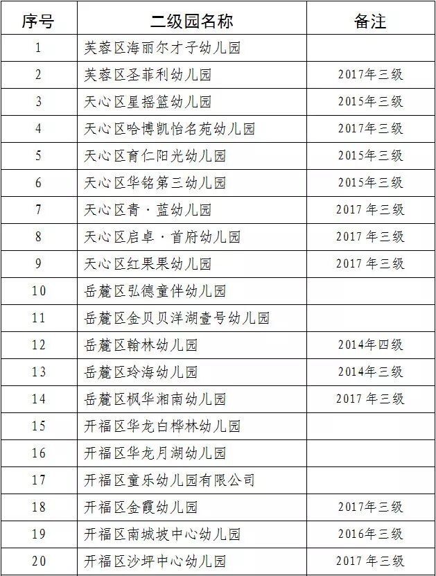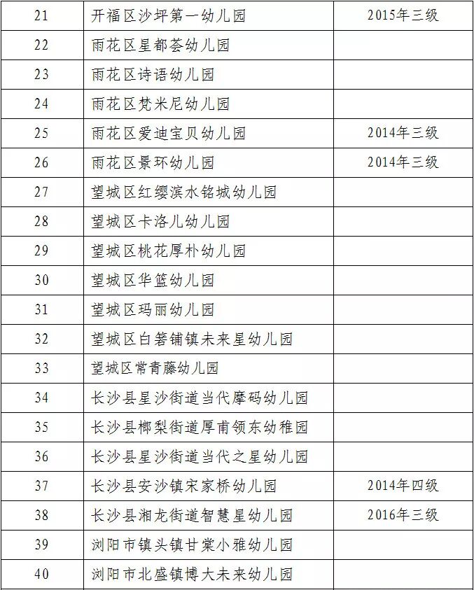2. 2014年认定的岳麓区玲海幼儿园、雨花区爱迪宝贝幼儿园、雨花区景环幼儿园,2015年认定的天心区星摇篮幼儿园、天心区育仁阳光幼儿园、天心区华铭第三幼儿园、开福区沙坪第一幼儿园、宁乡市金海幼儿园、宁乡市贝思特幼儿园,2016年认定的开福区南城坡中心幼儿园、长沙县湘龙街道智慧星幼儿园,2017年认定的芙蓉区圣菲利幼儿园、天心区哈博凯怡名苑幼儿园、天心区青·蓝幼儿园、天心区启卓·首府幼儿园、天心区红果果幼儿园、岳麓区枫桦湘南幼儿园、开福区金霞幼儿园、开福区沙坪中心幼儿园、浏阳市金刚金沙幼儿园、宁乡市爱琴湾幼儿园、宁乡市胖太阳幼儿园共22所幼儿园在2018年从原三级普惠性民办幼儿园经复评、复核认定升为二级普惠性民办幼儿园。