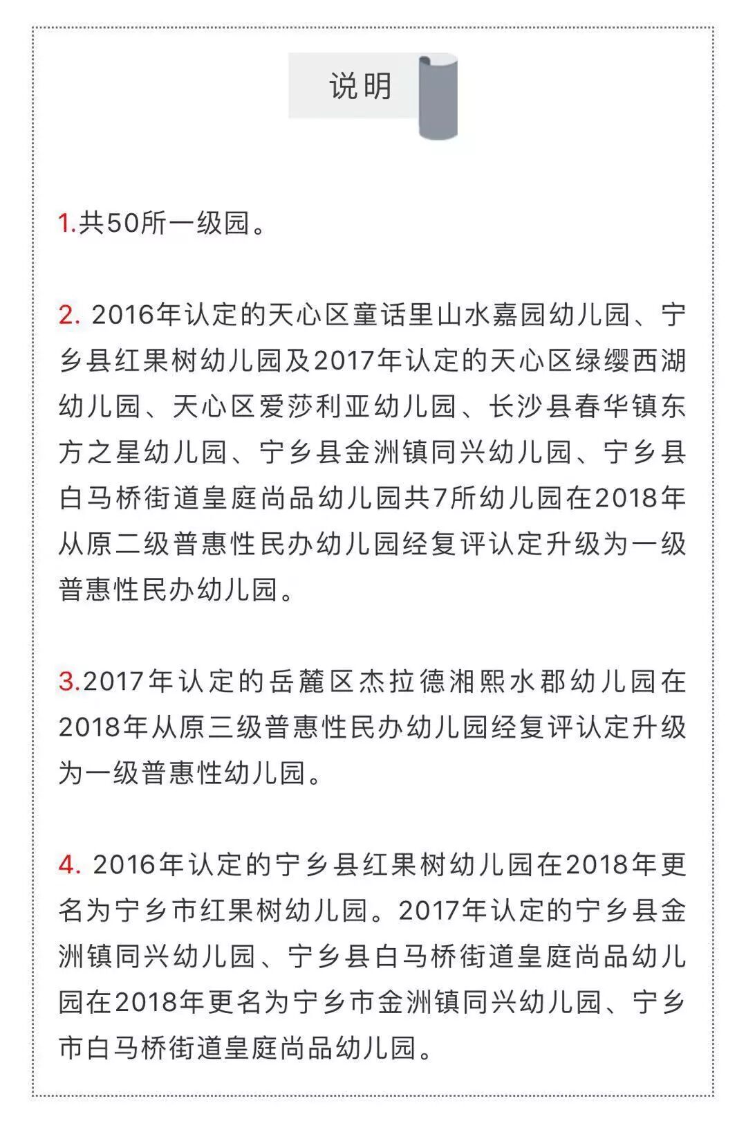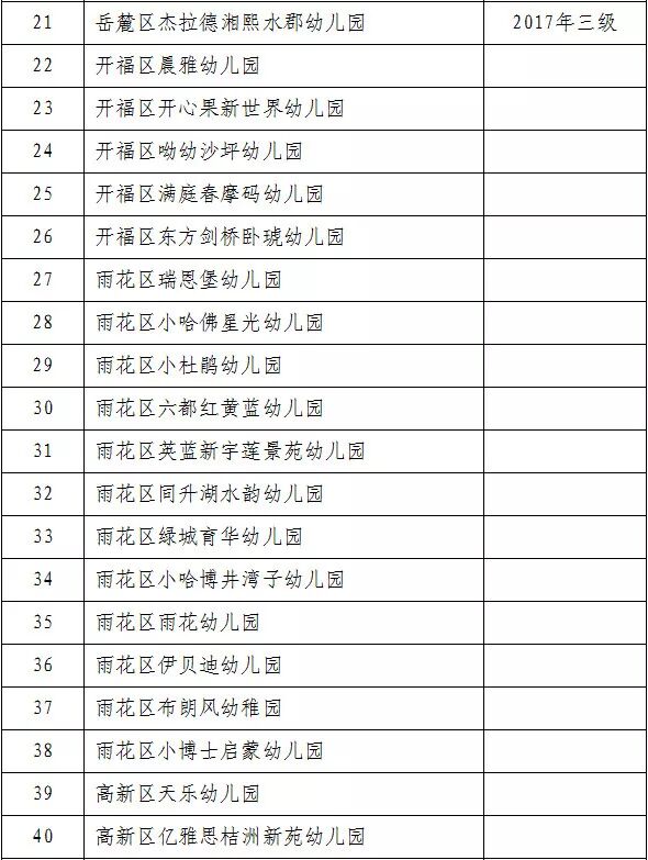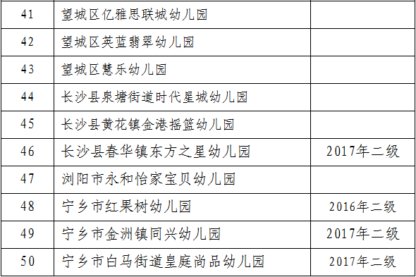 3.2014年认定的岳麓区翰林幼儿园、长沙县安沙镇宋家桥幼儿园共2所幼儿园在2018年从原四级普惠性民办幼儿园经复评认定升为二级普惠性民办幼儿园。