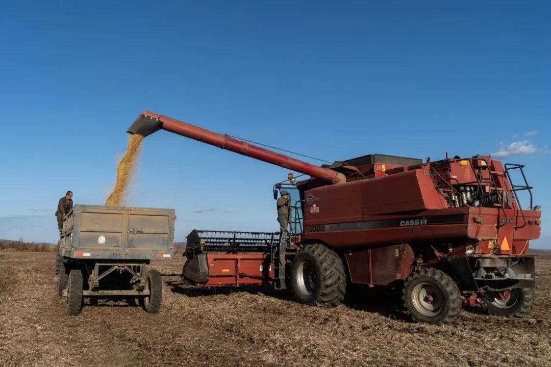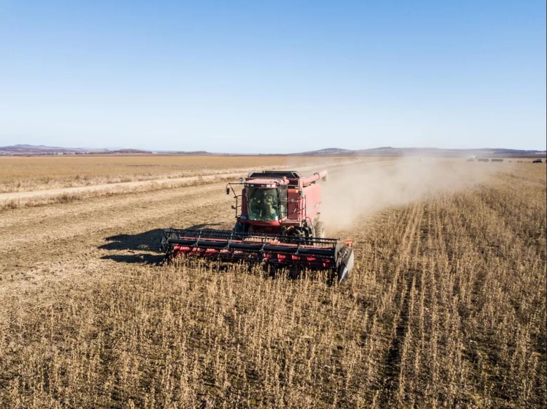 丰收的豆田仿佛一片金色的海洋,收割机发出阵阵轰鸣。曾经濒临消失的荒村,又重新活了过来。