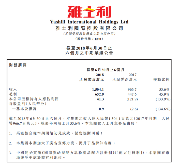 雅士利国际集团发布的2018年半年报显示,2018年上半年营收为15.04亿元人民币,比去年同期增长55.6%,毛利润为6.52亿元,同比增长45.9%,实现双增长。而其中集团旗下的有机奶粉品牌“瑞哺恩”与“Arla宝贝与我”(战略合作品牌),以及强势推出的羊奶粉品牌“朵拉小羊”和“多美滋”功不可没。