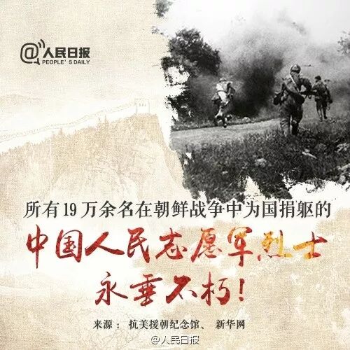 【向“最可爱的人”致敬】1950年的今天,志愿军打响入朝后的第一仗。两年零九个月的时光,18万战士献出了自己的生命。他们中,有挺胸膛堵枪眼的黄继光,卧火海忍剧痛的邱少云……保家卫国雄心在,青山处处埋忠骨。今天是抗美援朝纪念日 ,向长眠在异国他乡的战士们致敬!