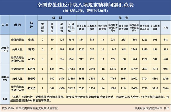 近日,中央纪委国家监委网站通报全国查处违反中央八项规定精神问题情况,2018年以来,截至9月30日,共处理60690人,含1名省部级干部;查处问题42817件。
