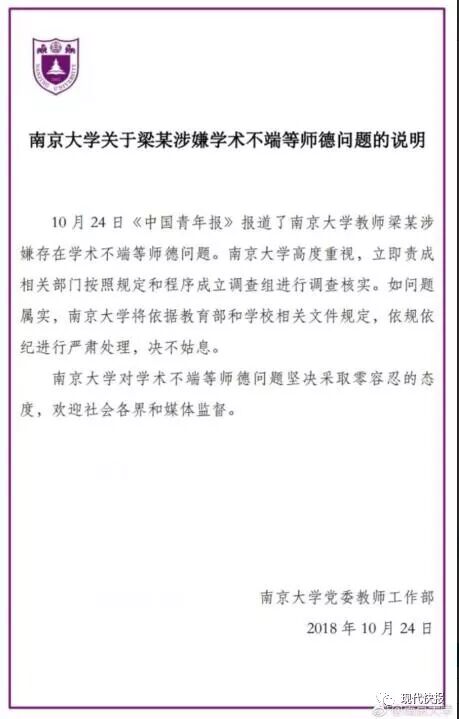 24日,南京大学社会学院行政办公室的一名工作人员告诉记者,南京大学高度重视此事,南京大学党委教师工作部按照规定和程序已经成立了调查小组进行调查与核实,如果问题属实,南京大学会依据教育部与南京大学相关文件规定依规依据进行严肃处理,绝不姑息。南京大学一直对学术不端等师德问题采取零容忍的态度,欢迎社会各界与媒体监督。