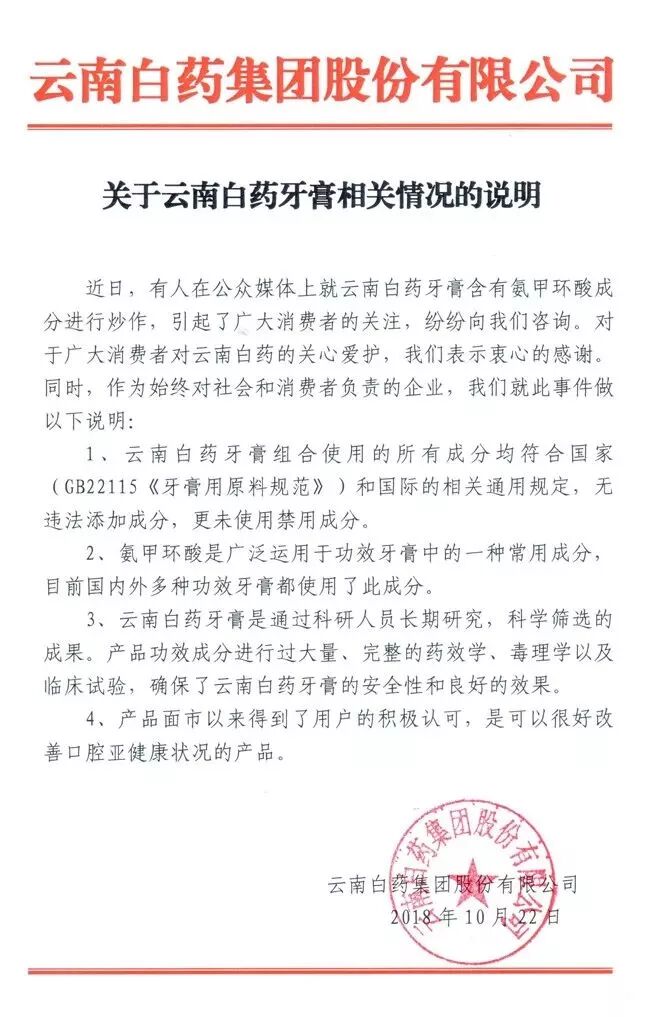 10月23日上午,云南白药官方网站上发布了一条情况说明称,氨甲环酸是广泛用于功效牙膏的一种常用成分,国内外多种功效牙膏都使用了此成分。并表示,云南白药牙膏使用成分均符合国家和国际规定,无违法添加成分,更未使用禁用成分。