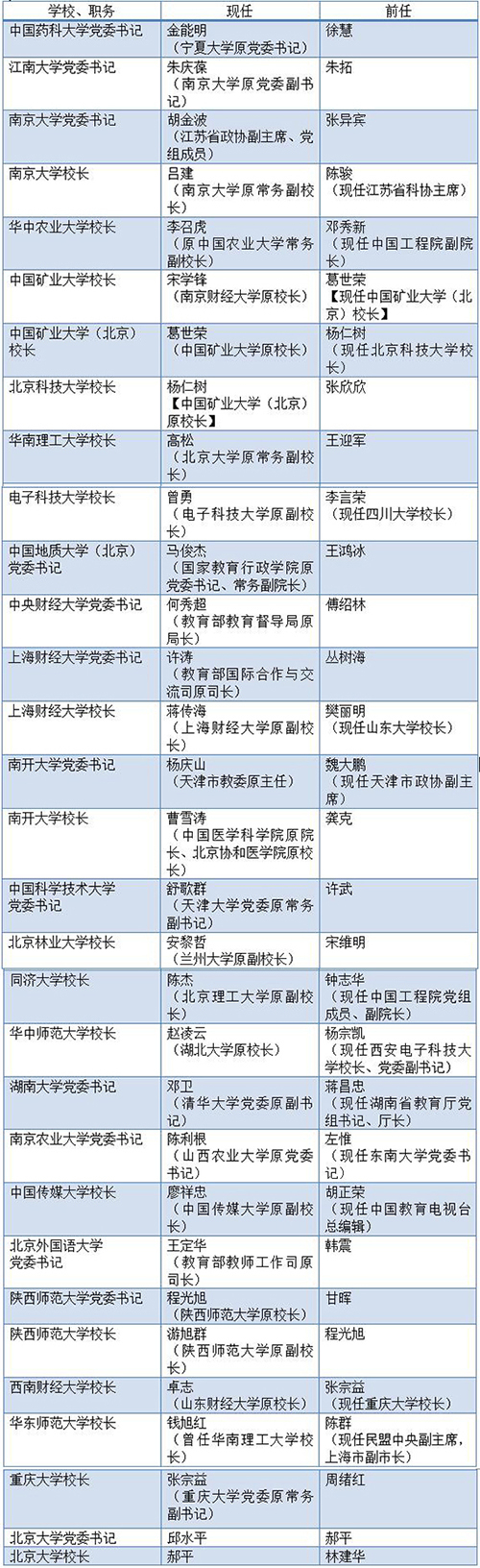 例如,新任南京大学党委书记胡金波,自2007年后历任江苏省教育厅副厅长、党组成员,江苏省委组织部副部长、常务副部长,江苏省政协副主席、党组成员等职;任中国药科大学党委书记的金能明,此前曾任内蒙古自治区巴彦淖尔市委常委、副市长(挂职)等。