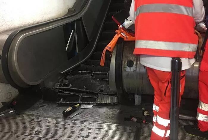 在地铁站内的自动扶梯上,激动的球迷们又唱又跳,导致电梯因承重不均而受力失衡,出现了故障!