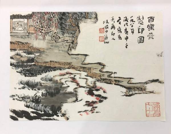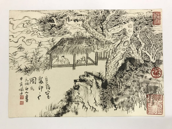 展览中,六大家的作品数量以陆俨少作品为最多,且无论是其册页作品、立轴作品,还是手卷作品,无不体现了以元人笔墨写造化之境的山水画精髓。尤其是《峡江险水图卷》,此卷前有林散之题,后有商承祚跋,是陆俨少1966年写貌三峡之作。众所周知,1945年陆俨少自巴蜀之地举家东归,由于火车票、飞机票紧张,画家携全家搭乘民工之木筏顺江而下,一路虽惊险,但得幸一睹三峡之奇特面貌,故而返沪之后,陆俨少屡写峡江险水图。此卷便是其一。画卷中自始至尾,俨然一气呵成,群峰高耸,江水急湍,在画家顺势而为的笔墨之下,表现得淋漓尽致。除了此卷,《豆庐室治印图册》、《峡江图》、《采药图》也是体悟陆俨少对传统笔墨继承与发扬的极好范本。 《豆庐室治印图册》八开之一