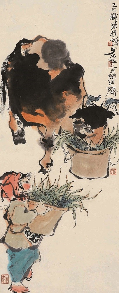 人格即画格,药翁画如其人,所作明丽、坦荡、大气,一派堂皇气象。晚年,画风丕变,辛辣而沉雄,豪气溢于画外,益显金石意韵,别开生面。 程十发《村童饲牛》