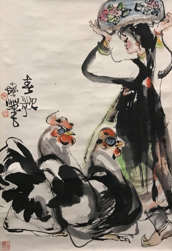 程十发先生为人谨慎、幽默,为艺则新奇、陆离。谨慎,使他历经劫难,终能安全着陆。幽默,使他每能在绝境中消解苦恼,逢凶化吉。新奇,令其治艺无禁地,无疆界,无程式,善于变通,敢于独造,有着取之不尽、出人意思的想象力和幻化力。所以,他的笔墨、造型、色彩、构图,乃至理念、风貌“集古今中外法”,而法外生法,别出心裁,一帜独标。 程十发《春歌》