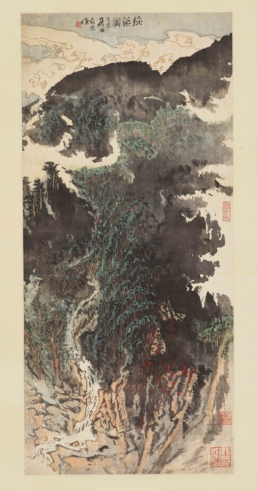 陆俨少先生,大半生命运坎坷,自责为“不谙世事”。虽在七十岁前历经灾难,蒙受冤屈,被扣了“右派”等四顶“帽子”,却说“桐乡岂爱我?我自爱桐乡”,对党和新社会有着深挚的痴爱和苦恋。他是敬畏优秀传统而不泥古的高人,平生无一藏画,自嘲“喜欢的买勿起,买得起的不喜欢”。他学习借鉴古贤名迹,有一套自创的独门功夫——“心临”。年轻时,面对展馆名迹,他可以在一张画前打桩似的驻足几个小时,忘情地默临,由一丘一壑到一草一木,从运笔用墨到格调、意趣,无遗漏地以心“扫描”,精微地探寻、感悟其内核。“文革”中我曾陪他去部队首长家观赏唐寅的小卷山水《放鹤图》。一尺多的画面,他注目达半小时之久。“心临”一过,私下语我:“这张画,唯有船上桅杆的那一笔,我还‘搭勿够’(水准达不到)。”时时与古人较量,处处找自身不足,乃至到一点一画里的得失高下。有人尝称:“笔墨等于零。”而在陆先生的心目中笔墨可是百分之百的紧要、必要,尤具丰赡的书写感。宛翁尚卧笔中锋,那浑脱自在、意韵悠扬的线条,半为天授半自造,足以令识者在梦牵魂绕中咀嚼其玄奥的至味。 陆俨少《采药图》