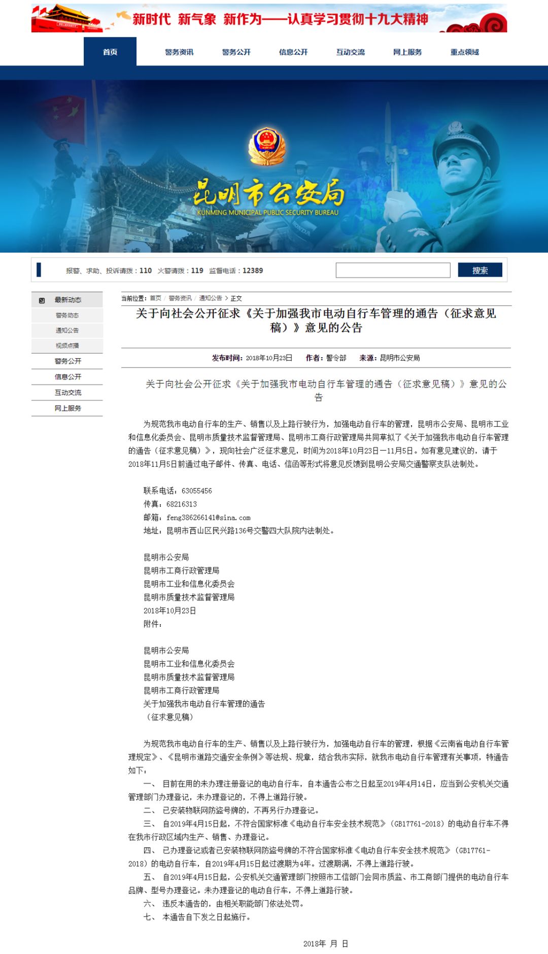 10月23日,昆明市公安局发布关于《向社会公开征求<关于加强我市电动自行车管理的通告(征求意见稿)>意见的公告》,在2018年10月23日—11月5日期间,向社会广泛征求意见。如有意见建议的,请于2018年11月5日前通过电子邮件、传真、电话、信函等形式将意见反馈到昆明公安局交通警察支队法制处。