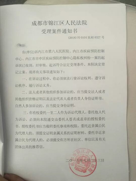 据报道,谢鹏以隐私侵权为由,将内江第六人民医院、内江市市中区疾控中心、内江市疾控中心诉至成都市锦江区人民法院。