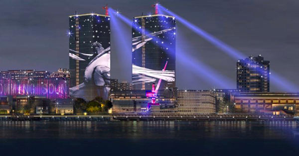 北外滩夜景空间以白玉兰广场为中心,多媒体灯光构图与建筑本体构图相协调,形成和谐的整体空间;形似“6个小胖子”的建筑群采用现代抽象构图,活跃空间气氛,沿河裙房,红屋顶时断时续,与老外滩形成有机连接,使北外滩灯光与老外滩、小陆家嘴灯光遥相呼应,和谐融合。