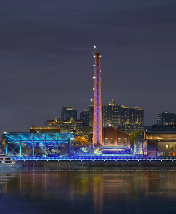 杨浦滨江承载着上海制造工业的文化,工业遗存多,高楼大厦少,相对其他区域夜间偏暗。在这次灯光改造提升中,通过针对不同建筑、环境采用不同光色,滨江国际的蓝色、渔人码头的暖白色、红色巨型塔吊、远处偏暖黄色背景住宅建筑的层次,融汇一体。