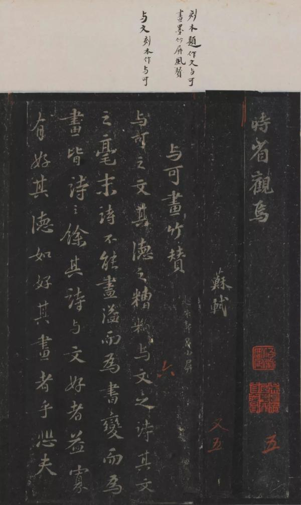 《西楼苏帖》是宋人汪应辰搜集苏轼书法刊刻的帖石拓本(三十卷全本早已失传,目前仅见六册宋拓本,5册藏于天津博物馆,1册藏于北京市文物公司),为宋刻宋拓,非常珍贵。其中就不乏有苏轼对文同墨竹的描述,以及对其人品的称赞。如《与可画竹赞》:与可之文,其德之糟粕;与可之诗,其文之毫末。诗不能尽,溢而为书,变而为画,皆诗之余。其诗与文,好者寡。有好其德如好其画者乎?悲夫!《文与可字说》:与可之为人也,守道而忘势,行义而忘利,修德而忘名,与为不义,虽禄之千乘而不顾也。《祭文与可文》是苏轼为文同写的祭文,讲到自己因念及文同逝世,“泪疾下而淋衣”、“梦相从而惊觉,满茵席之濡泪”。