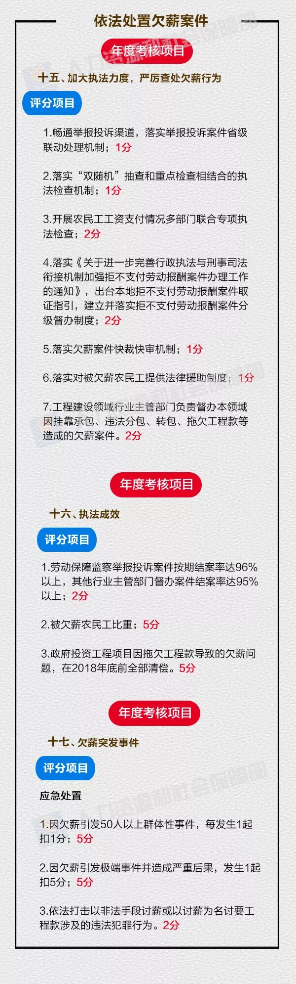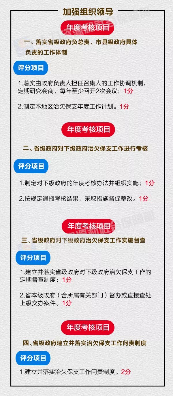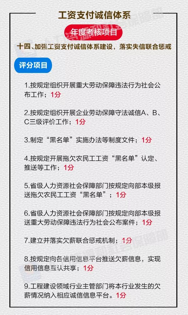 近日,解决企业工资拖欠问题部际联席会议印发《2018年度保障农民工工资支付工作考核细则》,共有考核指标65项,分为加强组织领导、工程建设领域欠薪源头治理、工资支付保障制度、工资支付诚信体系、依法处置欠薪案件和加强执法能力建设等5个方面。