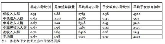 由表1可以看出,有67%的纳税人具有养老抵扣的资格,而这些人平均来看有1.98个兄弟姐妹。因此,平均每个纳税人每年因为养老费用可以抵扣5397元。但值得注意的是,低收入人群具有养老资格的比例较低,且兄弟姐妹数量较多,因此,低收入人群平均养老费用的抵扣较少,仅2783元。