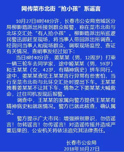 原标题:网传长春市菜市北街“抢小孩”系谣言