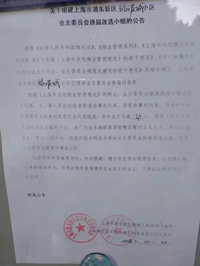 国庆节后,2018年10月10日,一份由唐镇人民政府,浦东新区建设和交通委员会联署的公告通知,据相关法规,绿波苑业主委员会改选小组由业主代表,乡、镇人民政府或者街道办事处代表,房管办事处代表、物业所在居民委员会代表组成,其中业主代表4人,据绿波苑居委书记解释,人才公寓将自动获得业主代表中的一票。其余3票经推荐产生。凡有损坏房屋承重结构,违法搭建,擅自改变物业使用性质,欠交物业服务费和维修资金、违规出租房屋等情形且未改正的业主,不得担任改选小组成员。