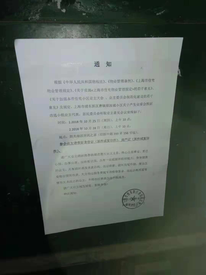 2018年10月17日,由唐镇街道绿波苑居民委员会张贴公告通知,《绿波城小区业主大会换届改选小组业主代表产生方式的公告》业主筹备组中业主代表产生方式公告如下: