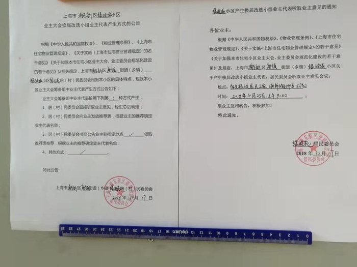 同时,居委会还发出了“产生换届改选小组业主代表听取业主意见的通知”,将居委听取业主推选代表意见的会议定于10月25日上午10点,当天为星期四