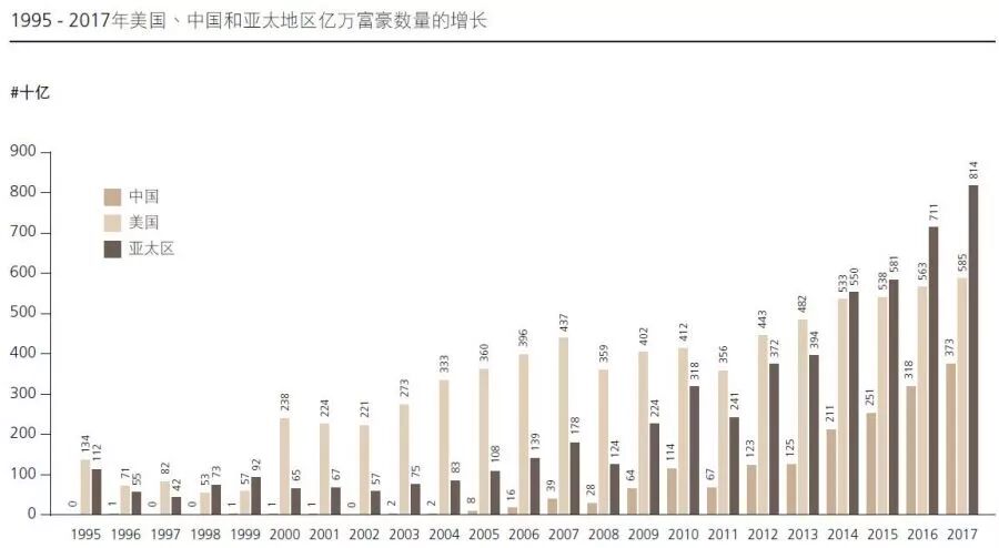 报告显示,2017年,199名白手起家的企业家首次成为亿万富豪,其中美国有30名,而中国有89名,这一数字是美国的3倍。这些新晋白手起家的亿万富豪中,近三分之一(30%)通过创新和改变商业模式积聚财富,而其余人则通过扩大业务积聚财富,特别是在亚太地区的巨大市场(如中国、印度和印度尼西亚)扩大业务。