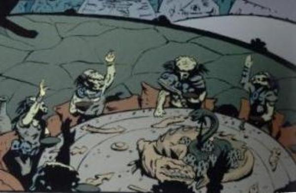 在这一格漫画里可以看到,铁血战士们在开宴会,圆桌中央的食物即为异形