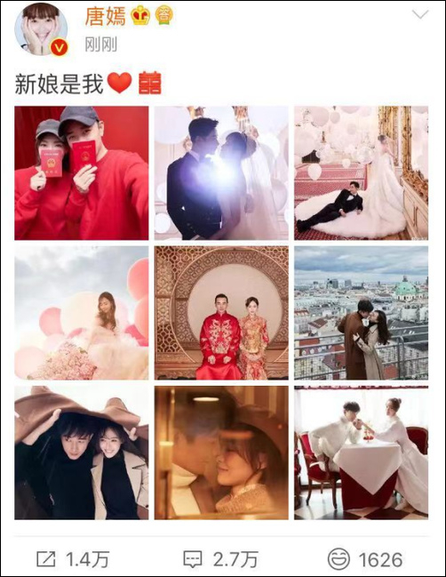 10月28日,唐嫣、罗晋微博晒婚纱照官宣结婚,罗晋配文“新郎是我”,唐嫣“新娘是我”,恋情公开两年后两人步入婚姻殿堂,网友纷纷送上祝福。