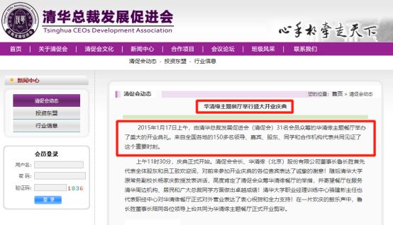 其官网资料显示,“清促会”于2012年3月14日在北京正式成立,接受清华大学职业经理训练中心(注:由清华大学继续教育学院管理)的指导。旗下有投融资、房地产、医疗健康、文化旅游、纺织服装等多个专业和产业合作委员会。