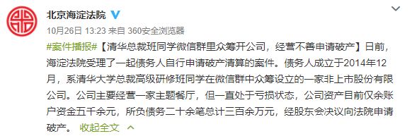 据海淀法院网披露,债务人称——设立公司的想法最初是在微信群里发起的,群内成员有120人左右,均是清华大学总裁高级研修班2007年至2013年不同班级的同学。
