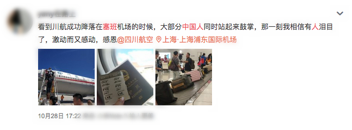 该网友的吐槽在社交网络上持续引起发酵,而另一边的救援工作也在有序进行着。据最新消息,28日起,滞留中国旅客陆续搭乘四川航空、东方航空、首都航空等航空公司包机回国,有网友发微博称:“飞机降落塞班时,大部分中国人同时站起来鼓掌,激动又感动。”
