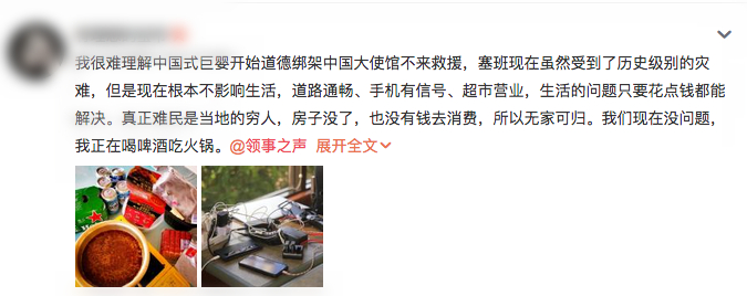 更有网友晒出照片,表示发文吐槽中国使馆不作为的人有故意“卖惨”之嫌,“塞班现在虽然受到了历史级别的灾难,但是现在根本不影响生活,道路通畅、手机有信号、超市营业,生活的问题只要花点钱都能解决。我们现在没问题,我正在喝啤酒吃火锅。”