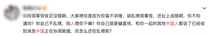 “和你一起的其他中国人都说已经收到中国(使馆)正在协调救援的消息,你怎么还在乱喷呢?”