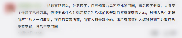 “找领事馆可以,注意态度。自己知道台风(要来了)还不抓紧回国,事后态度傲慢,这种对自然毫无敬畏之心,对别人的付出(认为)理所应当的人需要受点教训。”
