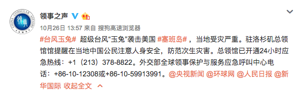 根据中国驻洛杉矶总领事馆发布的消息,10月24日“玉兔”袭击塞班后,外交部等国内相关部门和驻洛杉矶总领馆十分关注滞留的中国公民,并一直在就此开展工作。