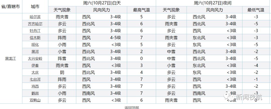黑龙江各地天气: