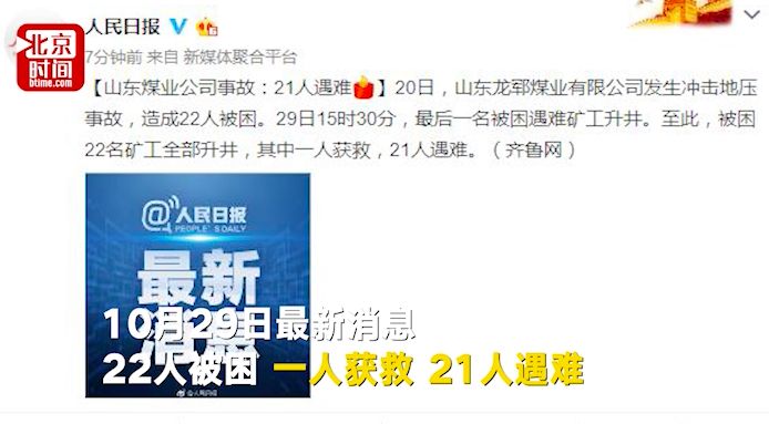 不过, 29日,龙郓煤业“10·20”冲击地压应急救援指挥部官方数据称,被困22人全部找到,其中1人获救,21人遇难。