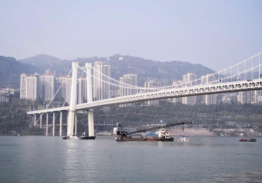 四川路桥集团的大型浮吊已赶到事故发生现场,准备吊起坠江大巴车。