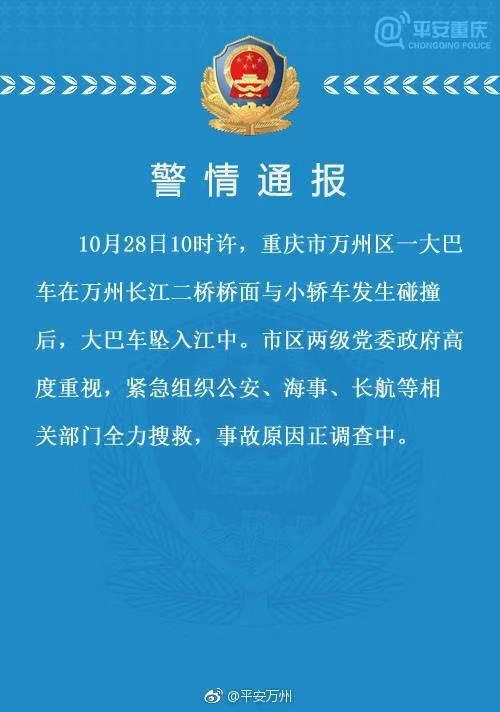 10月28日10时许,重庆市万州区一公交车在万州长江二桥桥面与小轿车发生碰撞后,公交车坠入江中。市区两级党委政府紧急组织公安、海事、长航等相关部门全力搜救。