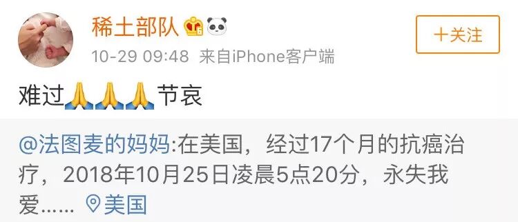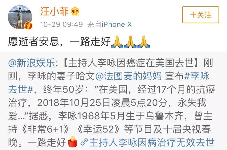 10月29日上午,李咏的妻子哈文@法图麦的妈妈 微博发布:“在美国,经过17个月的抗癌治疗,2018年10月25日凌晨5点20分,永失我爱…。”