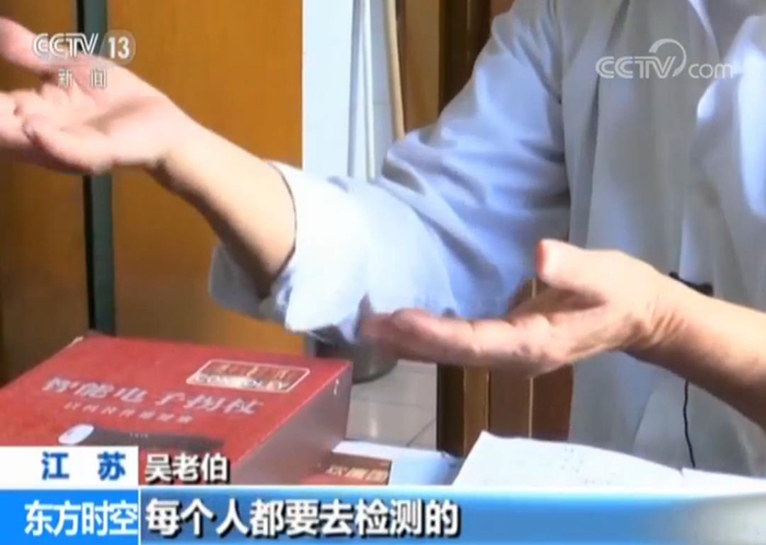 吴老伯:他拿了一个东西这样夹在这个地方,还有个金属棒,你这个人的血的各种功能(都能检测),每个人都要去检测的。