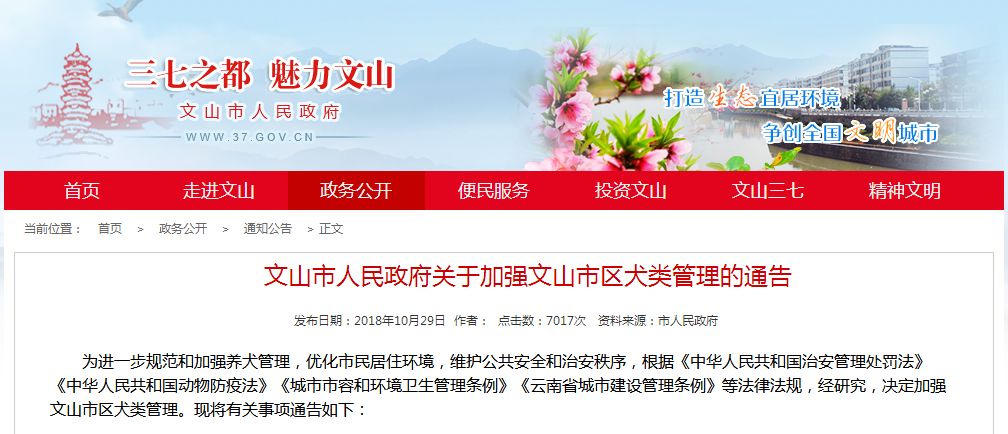 10月29日,文山市人民政府发布了“关于加强文山市区犬类管理的通告”↓↓↓