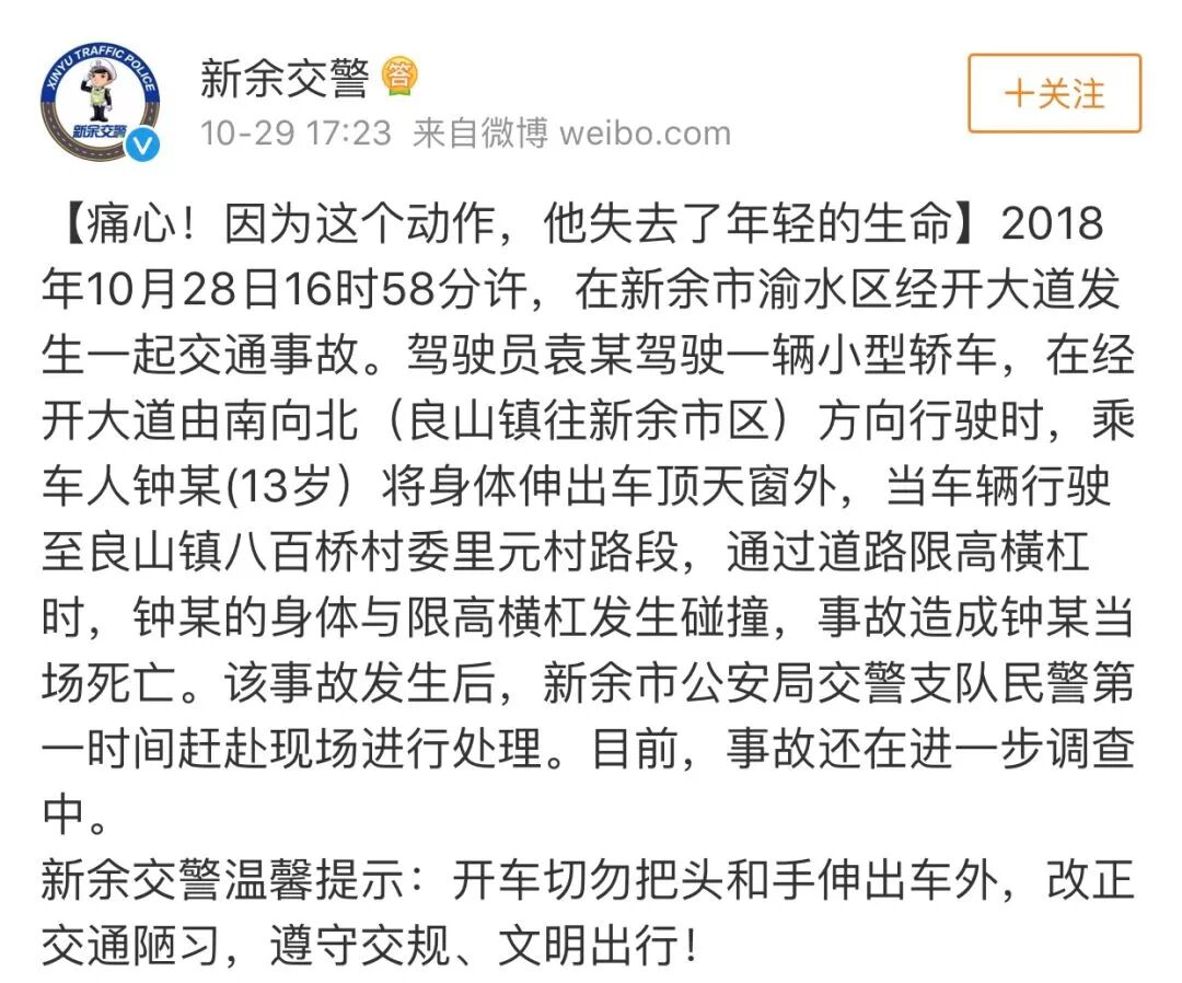 驾驶员袁某驾驶一辆小型轿车,在经开大道由南向北(良山镇往新余市区)方向行驶时,乘车人钟某(13岁)将身体伸出车顶天窗外。