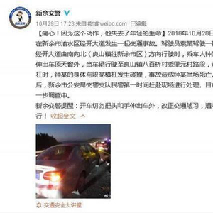 根据 @新余交警发布的消息:2018 年10 月 28 日 16 时 58 分许,在新余市渝水区经开大道发生一起交通事故。驾驶员袁某驾驶一辆小型轿车,在经开大道由南向北(良山镇往新余市区)方向行驶时,乘车人钟某 ( 13 岁)将身体伸出车顶天窗外,当车辆行驶至良山镇八百桥村委里元村路段,通过道路限高橫杠时,钟某的身体与限高横杠发生碰撞,事故造成钟某当场死亡。该事故发生后,新余市公安局交警支队民警第一时间赶赴现场进行处理。目前,事故还在进一步调查中。